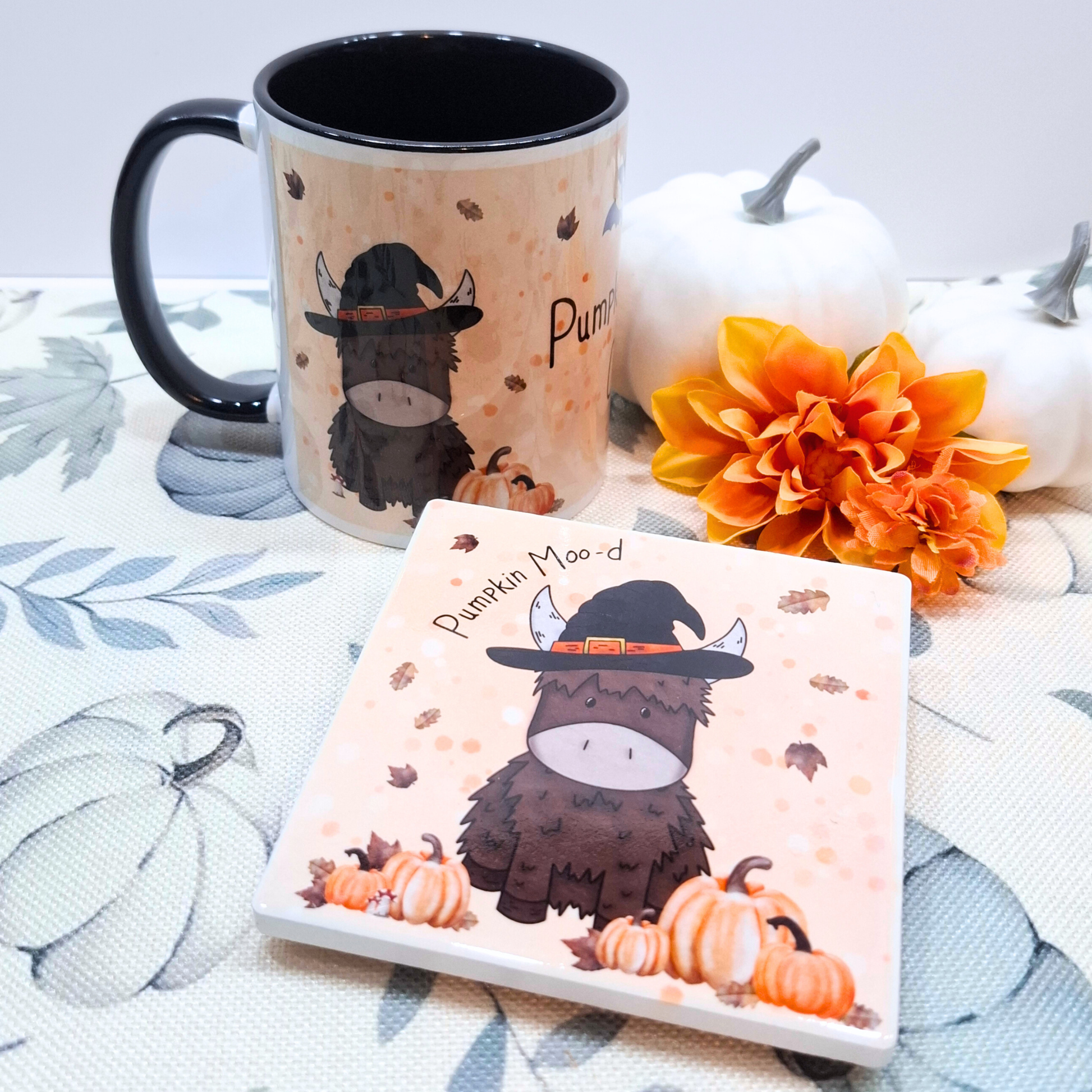 Bring the pumpkin patch home with this orange square coaster, featuring my hand-drawn Highland Cow and pumpkins. A cosy autumn vibe for your favourite drink.